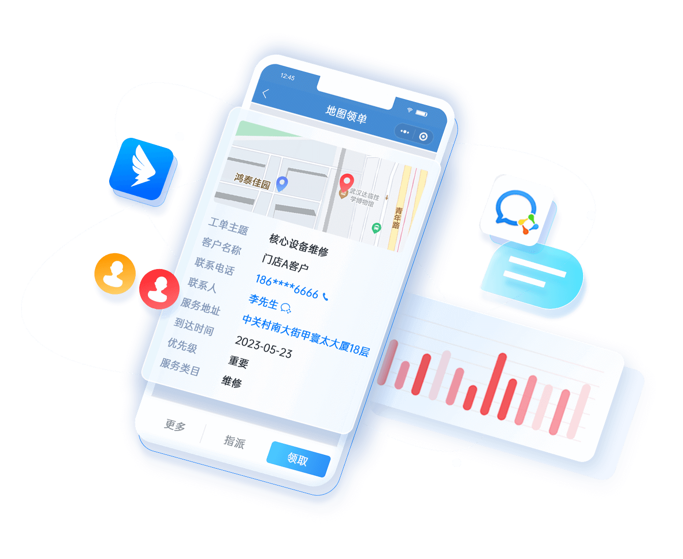 • 內外工單結合,客戶發起的報修工單自動派發到企業內部部門接單處理